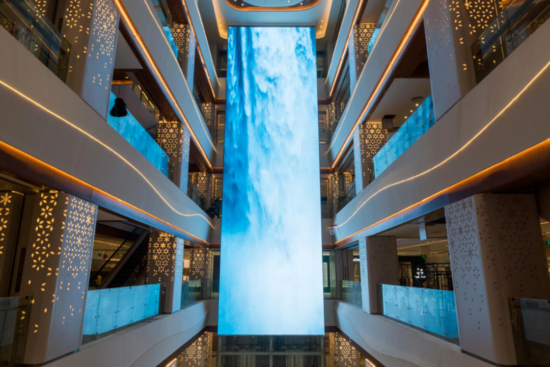 荔胜广百广场位于广州荔湾芳村区,设计主题为“芳华如熹,百花如船”。芳华如熹,指荒村到芳村从开发到现在,正是风华的阶段;百花如船,芳村以花卉为主,传承至今。同时,通过复刻在此区域的宋代羊城八景之一“大通烟雨”的场景,将其打造成为文化与商业融合的城市地标性景观。室内主要利用观光梯外立面LED屏幕及双层观景平台打造亮丽的景观效果。